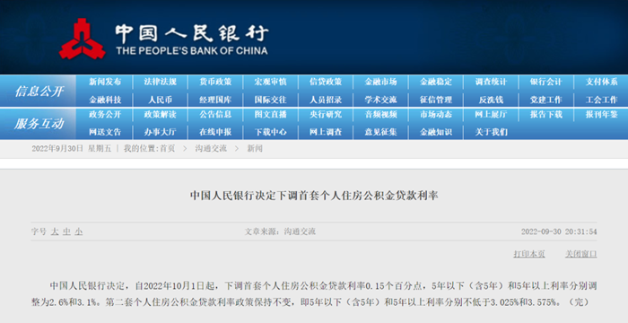 9月30日中國(guó)人民銀行發(fā)布:自2022年10月1日起,下調(diào)首套個(gè)人住房公積金貸款利率0.15個(gè)百分點(diǎn),5年以下(含5年)和5年以上利率分別調(diào)整為2.6%和3.1%。第二套住房公積金貸款利率政策保持不變,即5年以下(含5年)和5年以上利率分別不低于3.025%和3.575%。