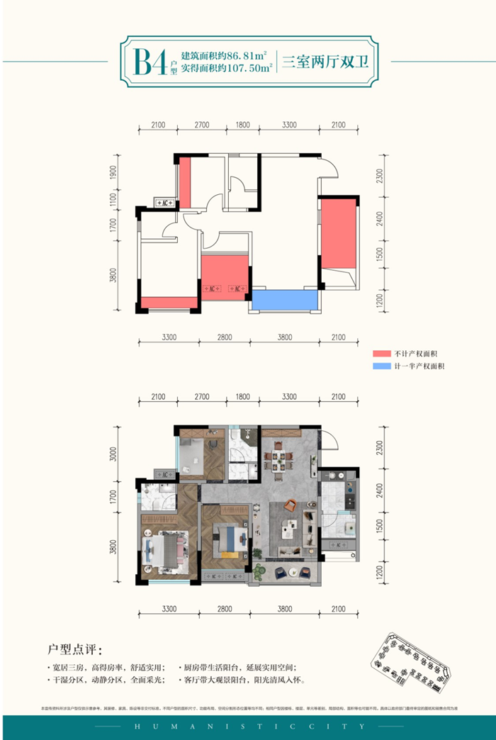 B4戶型作為楓丹郡項(xiàng)目熱銷戶型,三室兩廳雙衛(wèi),建面約86.61㎡,實(shí)得面積約107.5㎡,得房率約為124%。