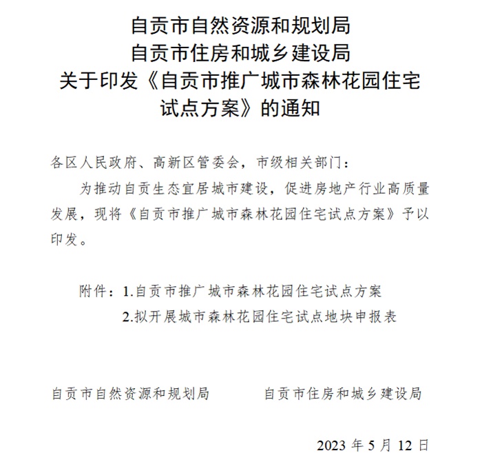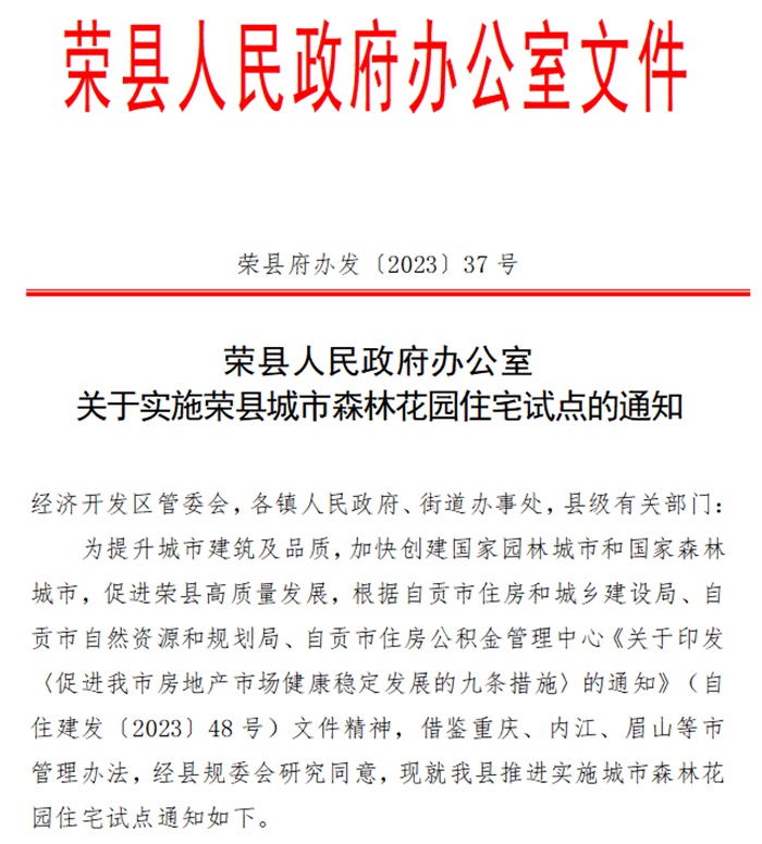 2023年7月19日,榮縣人民政府辦公室文件,發(fā)出關(guān)于實(shí)施榮縣城市森林花園住宅試點(diǎn)的通知。